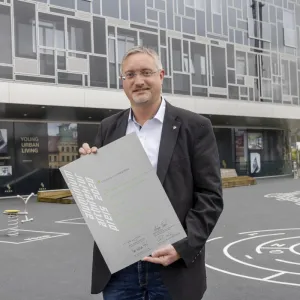Gemeinsam mit dem siegreichen Metallbaubetrieb wurden das Architekten-Team der LAAC zt-gmbh, der Bauherr Pema, der Aluminium-Profilsystem-Anbieter AluKönigStahl und der Oberflächenveredelungsbetrieb Piesslinger mit einer Urkunde aus Aluminium ausgezeichnet.