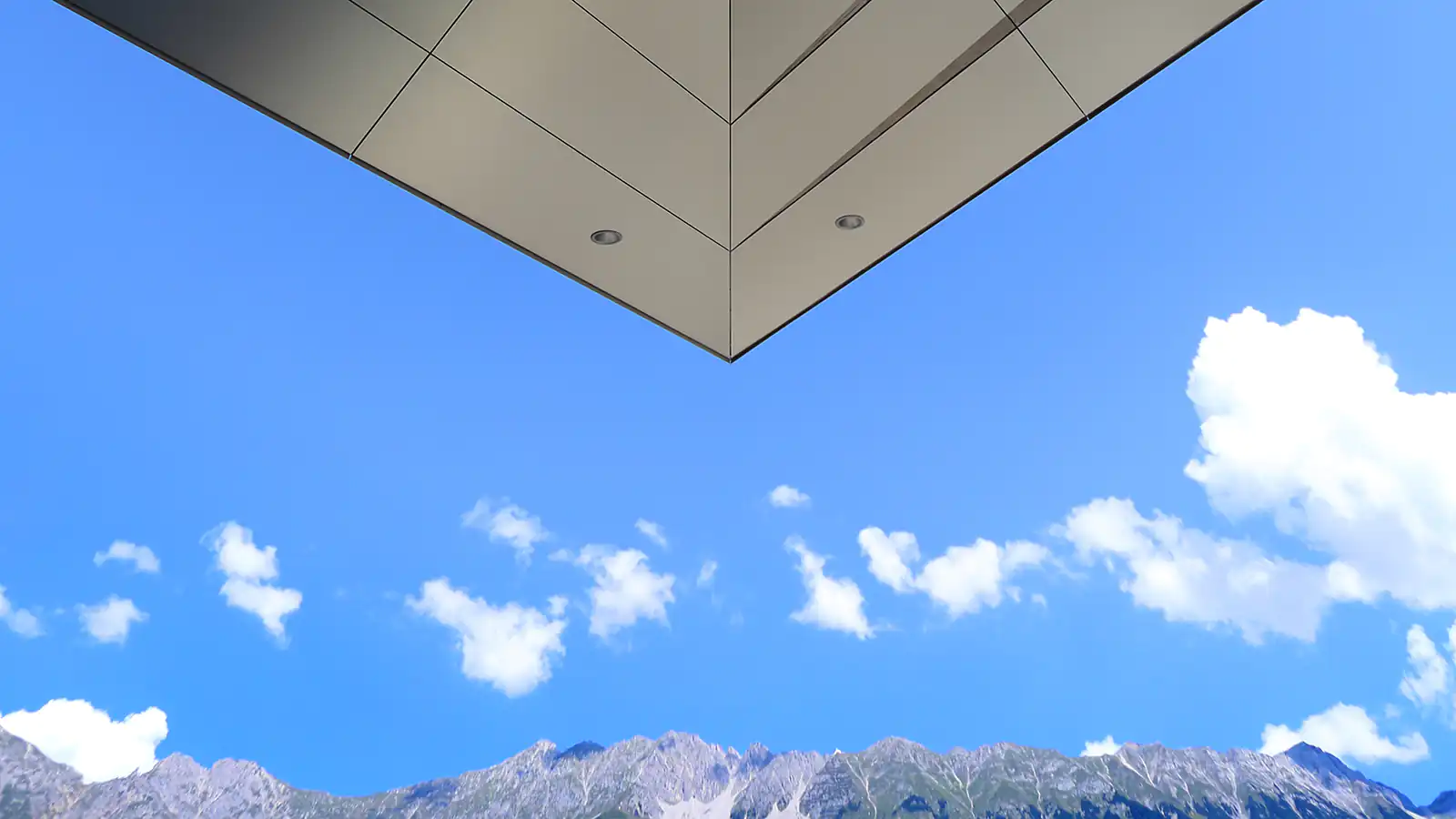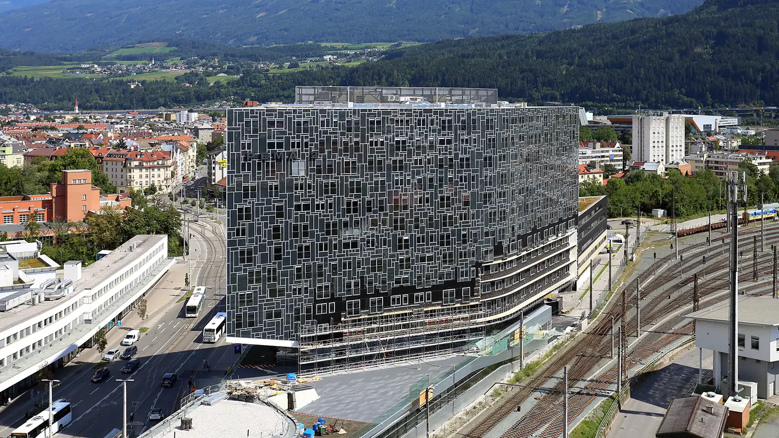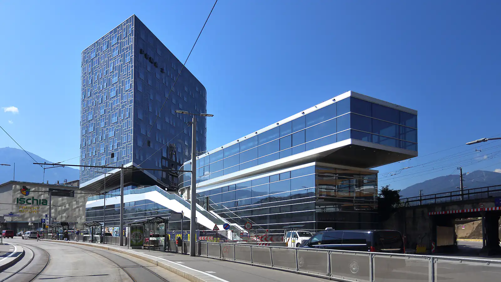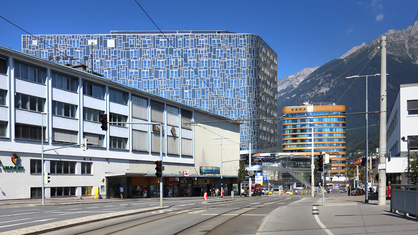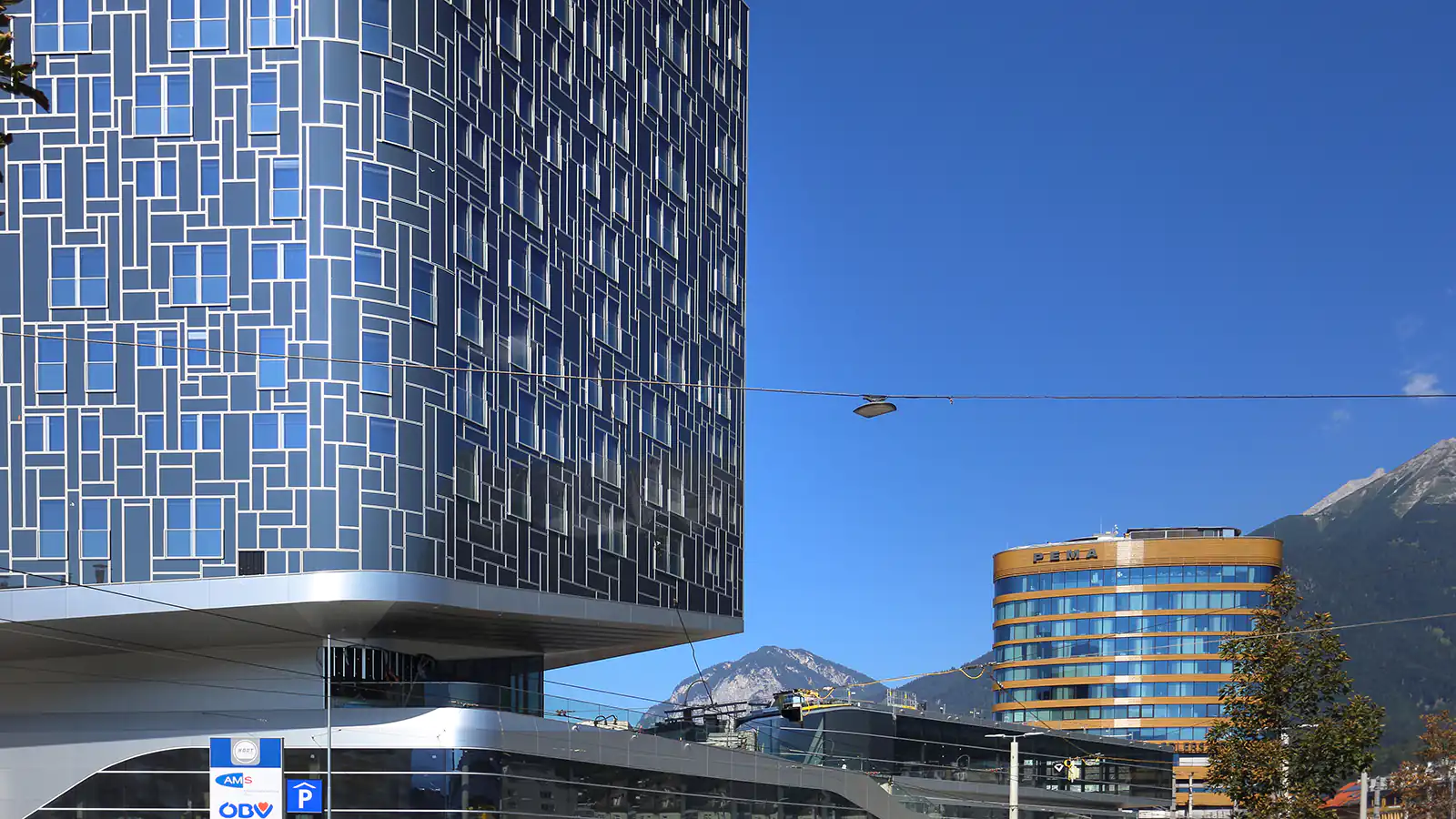 Nur 10 Minuten vom berühmten Wahrzeichen „Goldenes Dachl“ entfernt, fassen sich rund 8.000, in Aluminium gefasste, leicht gewölbte gläserne Elemente zu einem geometrischen Puzzle zusammen und spiegeln einzigartig die Umgebung wider.