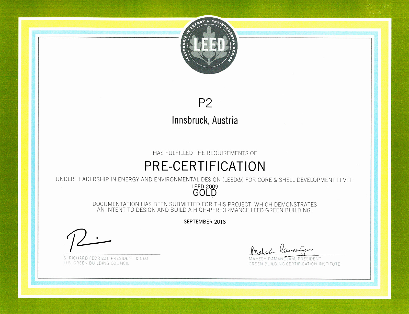 Das Zertifizierungssystem vom U.S. Green Building Council wurde im Jahre 1988 entwickelt und ermöglicht verschiedenste Gebäude in Hinblick auf ihre Nachhaltigkeit zu beurteilen. Das amerikanische Zertifizierungssystem findet inzwischen weltweit Anwendung und deckt im Wesentlichen die ökologischen und sozialen Dimensionen der Nachhaltigkeit ab. „Das LEED-Vorzertifikat in Gold zeigt uns, dass wir auf dem richtigen Weg sind“, zeigte sich Schafferer überzeugt. Um die Auszeichnung zu bekommen wurde bei P2 nicht nur die Energieeffizienz erhöht und der Wasserverbrauch um 20 Prozent reduziert, sondern schon bei der Baustelleneinrichtung darauf Bedacht genommen, Umweltbelastungen zu vermeiden.